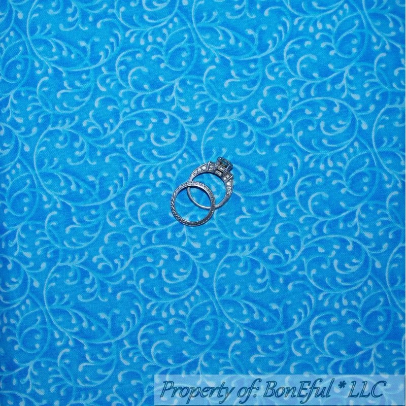 Signature BonEful FABRIC FQ Cotton Quilt Turquoise Blue White Flower Scroll Swirl Calico S