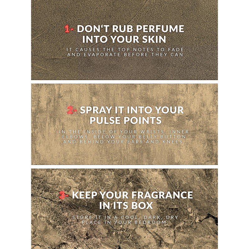 - How to Use: 1. Shake the perfume bottle gently before each use to ensure proper mixing of the fragrance. 2. Remove the cap or spray nozzle and hold the bottle approximately 6-8 inches away from your skin. 3. Spray the perfume onto your pulse points or apply a few drops using your fingertips. 4. Allow the perfume to dry naturally without rubbing. 5. For a longer-lasting scent, consider layering with scented body lotions or creams. 6. Store the perfume in a cool, dry place away from direct sunlight and extreme temperatures.