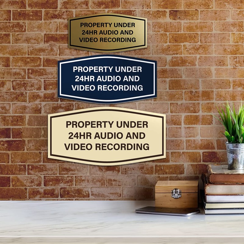 Our Signs ByLITA Fancy Property Under 24Hr Audio and Video Recording Sign can be attached to the door, wall or window of your home or business. The sign text and design work is laser engraved into sturdy plastic. Each sign comes with an adhesive foam backing, allowing them to be attached to any flat surface. Comes in multiple colors. Our protected signs are great for your home, business or property. Medium sign is 3.5"H X 7" W