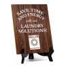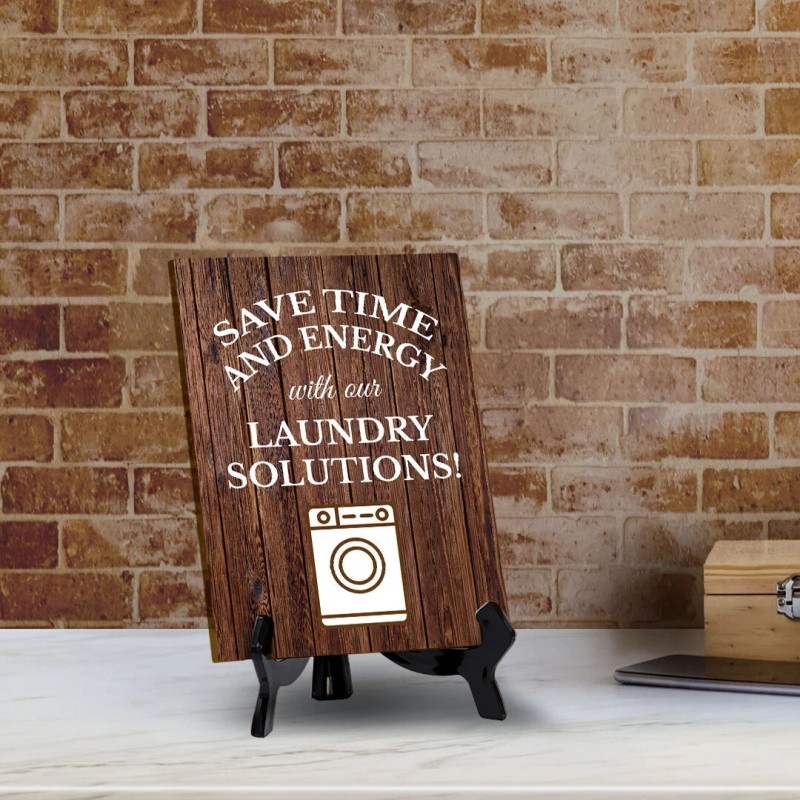 Save Time and Energy with Our Laundry Solutions!, Decorative Table Sign. This table sign comes with it's own black acrylic easel, easy to set up and display on any flat surface.