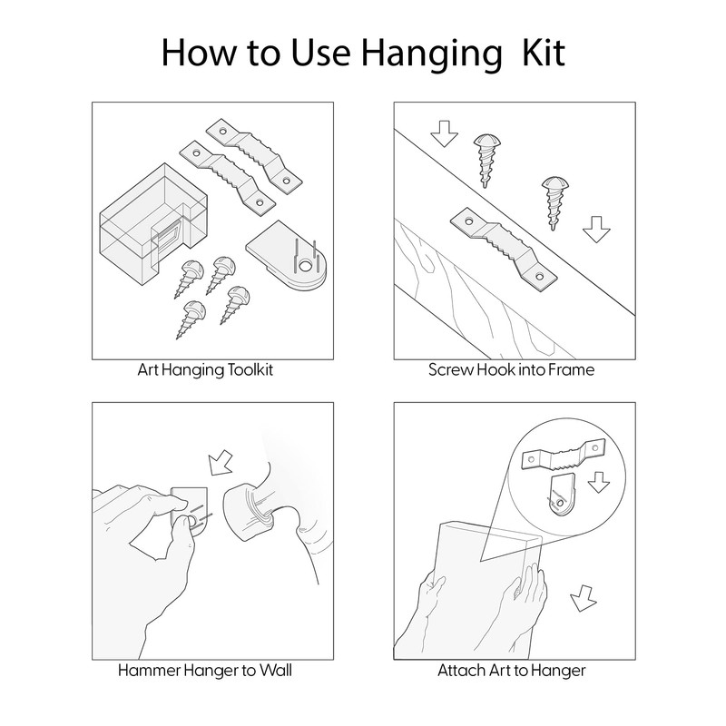 Our artwork comes with different sizing options. Measure your wall, then pick the appropriate size. Hanging is made simple with our complimentary hanging accessory toolkit.