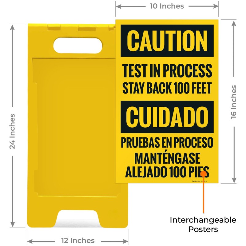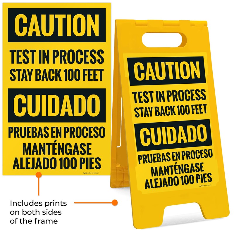 Sigo Signs Caution Test in Process Stay Back 100 Feet Bilingual Sidewalk Sign Kit, 10x16 Inches, with A Frame Stand, Made in USA