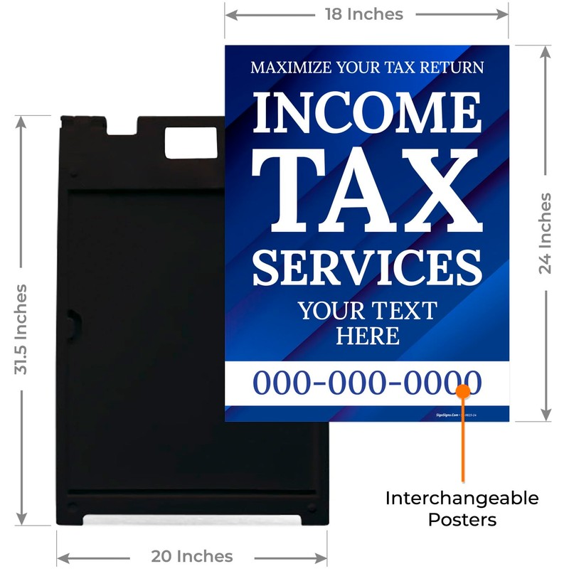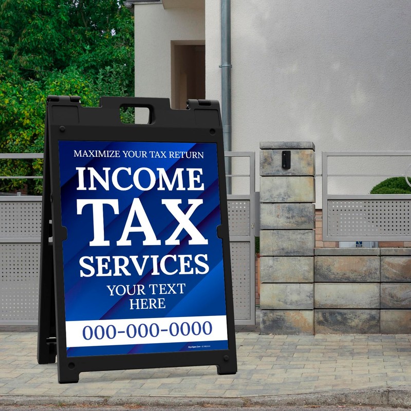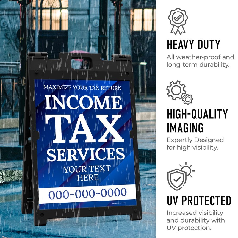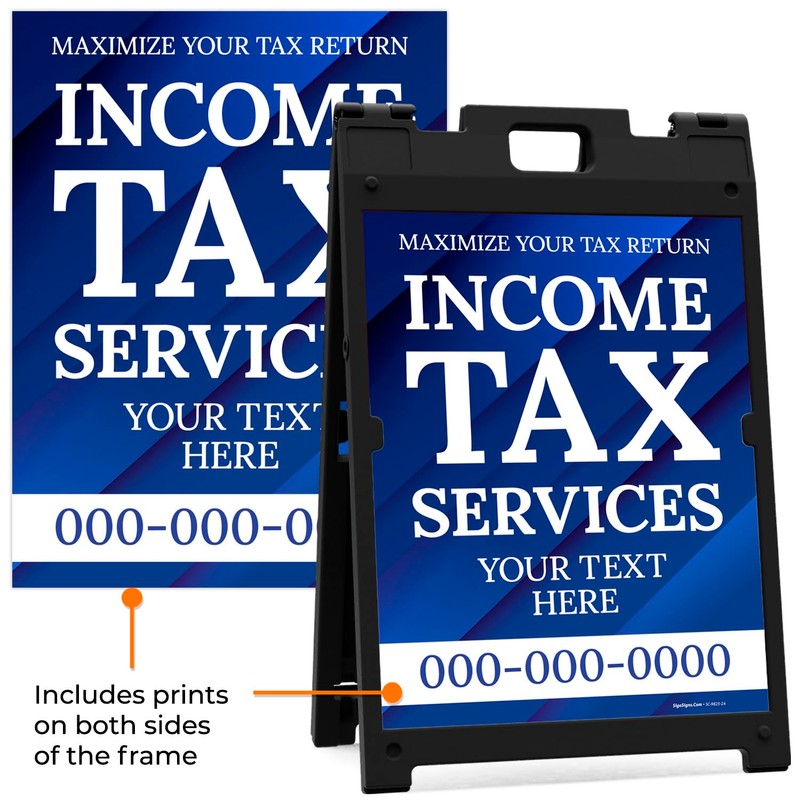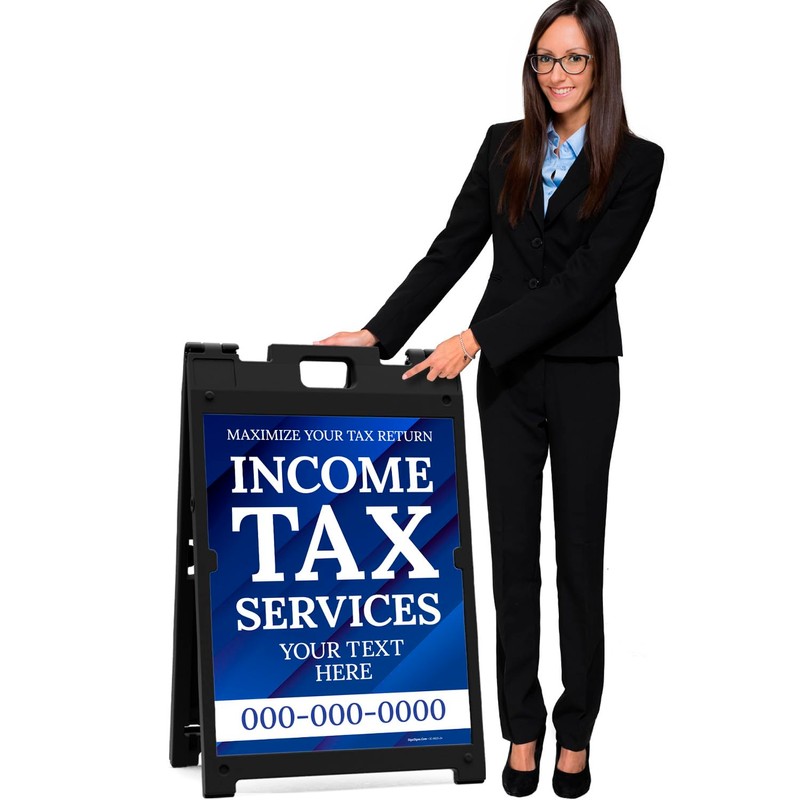 Sigo Signs, Custom Income Tax Service Sandwich Board/A Frame Sign Kit, Personalized Text and Phone Number with Two Panel Indoor/Outdoor Sign, 18x24 Inches, with A Frame Stand, Made in USA