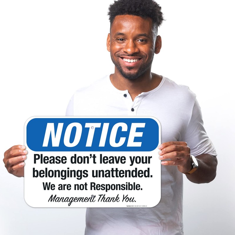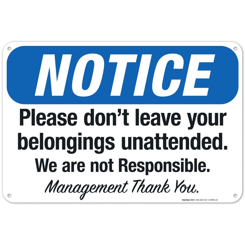Sigo Signs, Please Don't Leave Your Belongings Unattended We are Not Responsible Sign, 12x18 Inches, 55 mil Thick HDPS (high Density polystyrene), Made in USA