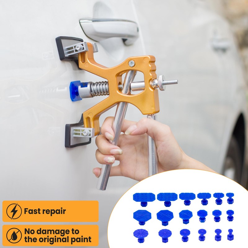 - FAST & EASY & BEGINNER-FRIENDLY: No experience? No problem! With simple, easy-to-follow instructions, this auto dent puller kit is designed for anyone—from car enthusiasts to first-time DIYers. Repairing your car yourself has never been easier or more rewarding. Get professional results without the stress or hassle. Our car dent repair tools can removal 99% of your car's dents in 30 minutes.