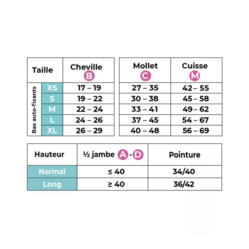 Featuring Class 2 medical compression, these stockings promote venous return, relieve heavy legs and reduce swelling. Made from 34% organic cotton, they provide optimum softness and are specially designed for sensitive or reactive skin. Thanks to their self-tightening structure, they stay firmly in place all day long, without discomfort or irritation.