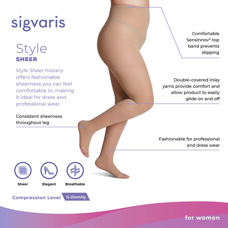 - SHEER COMPRESSION PANTYHOSE: Sigvaris Style Sheer compression pantyhose are a fashionable and comfortable compression style ideal for dress and professional wear. This sheer, hosiery option promotes leg health and relief from a range of symptoms.