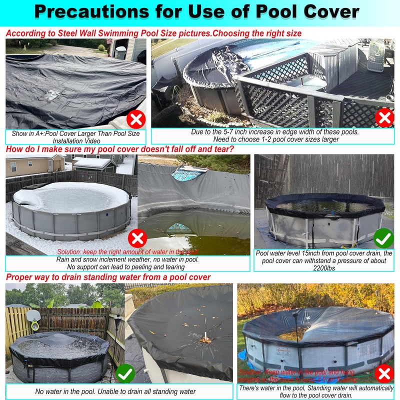 - 14FT Round Pool cover: Take Care to Choose the Right Size:🌞General Above Ground Swimming Pool please buy the corresponding size 🌞Steel Wall Above Ground Swimming Pool select 15FT Pool cover. Choose one size up. (It is recommended to measure the diameter of the pool so that it is not too small to be used) Please measure the diameter of your pool before purchase for better drainage function and quick tightening function!