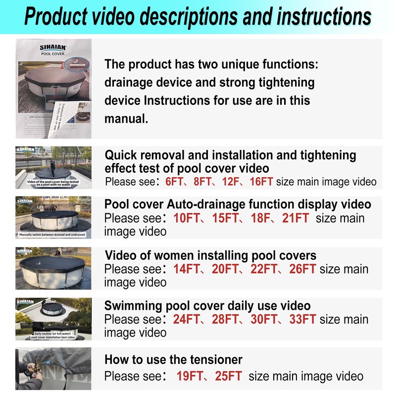 - EXCLUSIVE TIGHTENING DEVICE: SIHAIAN black pool cover hand sews the exclusive tightening device inside the Pool Safety Cover, the tightening device can help the user install and remove the round pool cover quickly. After installation. The pool can withstand adult males rolling around on the SIHAIAN solar pool cover when it's full of water. Strong stability against wind, rain, snow, and other adverse weather conditions (🔧See 24FT, 28FT, 30FT, 33FT video for installation results🔧)