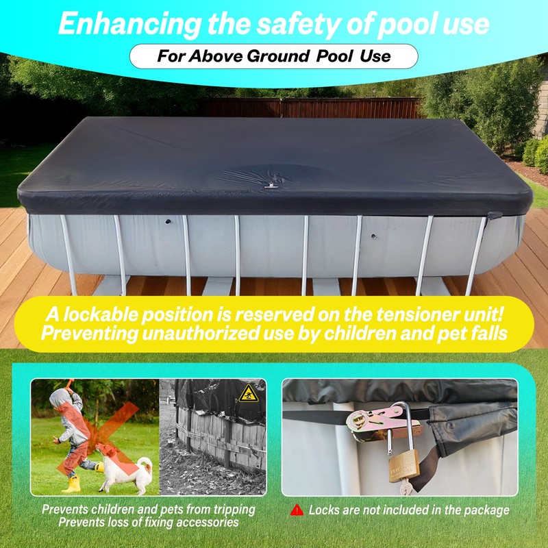 - 🌞[Easy to Use and Powerful Pool Cover] SIHAIAN multifunctional pool cover is made of 420D color woven polyester fabric, with an innovative design(Diagonal Double Tensioner device and add open/close drain at center point of pool cover) Realization of effective protection for rectangular pool and oval pool. For use with SIHAIAN Fixed Component Kit (need to buy separately) Can be used for In-ground pool, outdoor sunshade, and Greatly enhances the protective effect of above-ground pools