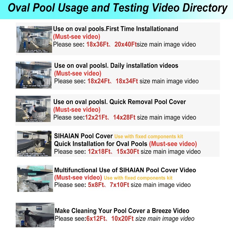 - 🌞[Selection and Testing] Select 420D fabric for pool cover(High color fastness, anti-UV, absorbs heat, and keeps water warm to achieve the solar pool cover effect) Complies REACH new EU environmental standard. Not produce harmful substances after sunlight exposure safe contact with the skin. We filmed a series of pool cover use and functions videos of rectangular and oval pools at the SIHAIAN testing base. Please see the video directory, providing users with a better pool cover experience