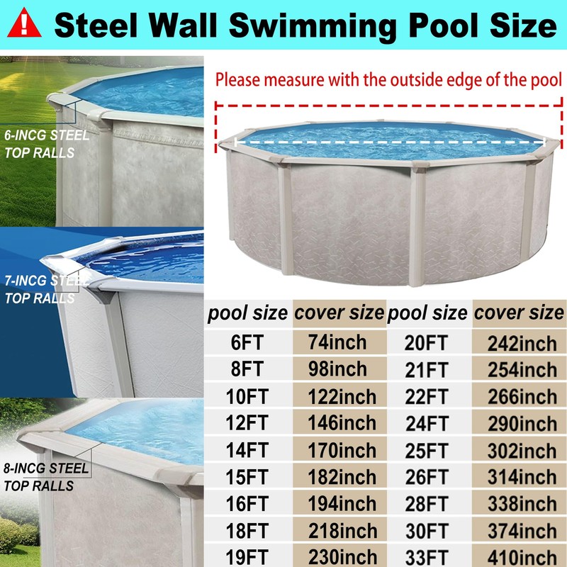 - 🌞[Take Care to Choose the Right Size] SIHAIAN 30Ft Pool Cover is specially designed for a 30Ft frame-round swimming pool. 30Ft Steel Wall round swimming pool 6-8 inches more width along the outside edge. Be sure to measure the actual diameter so that the pool cover is not too small to use! If the actual diameter of your pool is larger than 374 inches. Please buy one size larger pool cover(Measure the diameter before purchase for better drainage function and quick tightening function)