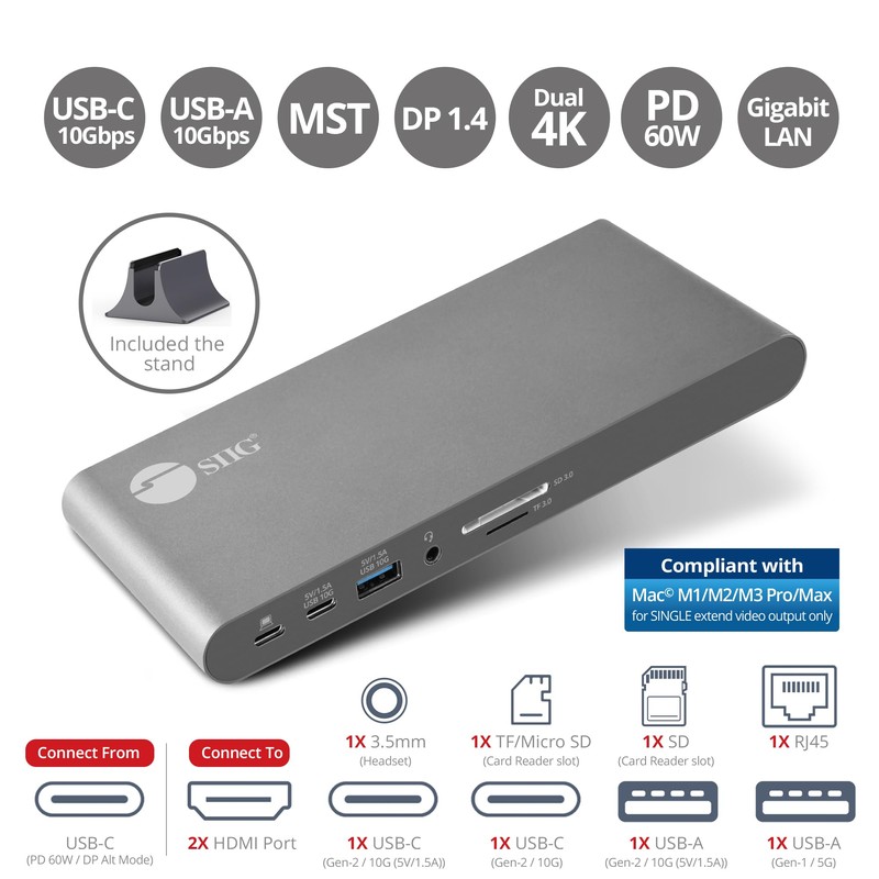 SIIG's JU-DK0N11-S1 USB-C Dual Video MST Docking Station is recommended to add a ton of convenience to your work. Not only does it give you a whole lot more screen space, but also gives you access to new devices, plus unparalleled charging power. Benefits Add up to two displays - Supports 2 display outputs simultaneously via 2x HDMI ports (DP Alt mode & Thunderbolt 3 compatible).