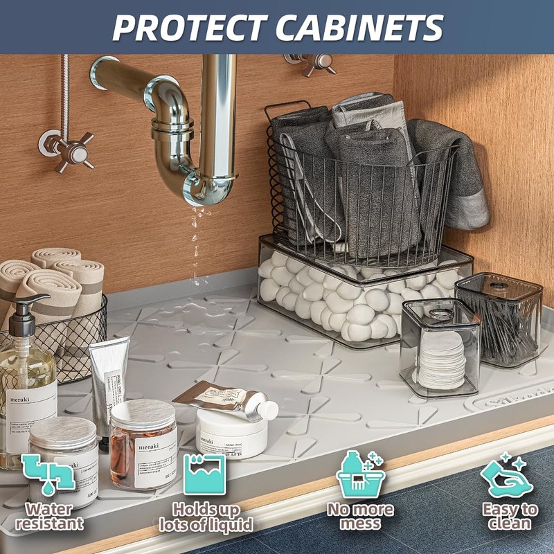 - Latest Upgrade for Ultimate Protection SIKADEER introducing the 2025 new under sink mat, crafted from 100% food-grade silicone for safety and durability. Our undersink mat features raised edges designed to hold significant amounts of liquid, with enhanced thickness for superior waterproof performance. It provides unmatched protector liner cabinets, shelves, and floors against plumbing leaks, stains, scratches, and spills.