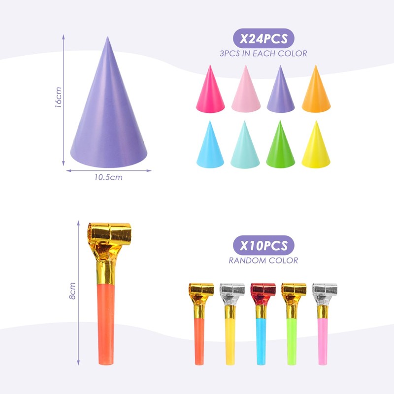 - 【Product Content】You Will Receive 24 Pieces Of Party Hats And 10 Pieces Of Whistle Toys. The Size Of The Party Hat Is 16*10.5Cm, And The Colors Include Pink, Green, Yellow, Orange, Sky Blue, Rose Red, Purple And Light Blue; The Size Of The Whistle Toy Is 7.5Cm, The Color Is Random, Suitable For Various Uses Parties And Celebrations.