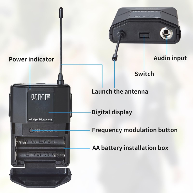 - ★PACKAGE CONTENT:1 x UHF wireless receiver, 4 x Bodypack, 4 x Lavalier Microphone, 4 x Headset Microphone, 1 x power adapter, 1 x 6.35mm audio cable, 4 x anti-rolling rings, 2 x Antennas, 1 x user manual. *Note: AA battery Not included.