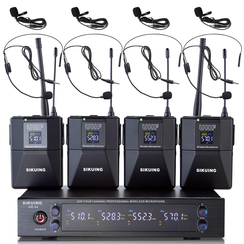 SIKUING 4 Channel UHF Wireless Microphone System with Lavalier Headset Mics, 4x50 Adjustable Frequencies, Ideal for Karaoke Meeting Church, 300ft Range (4 Bodypack)