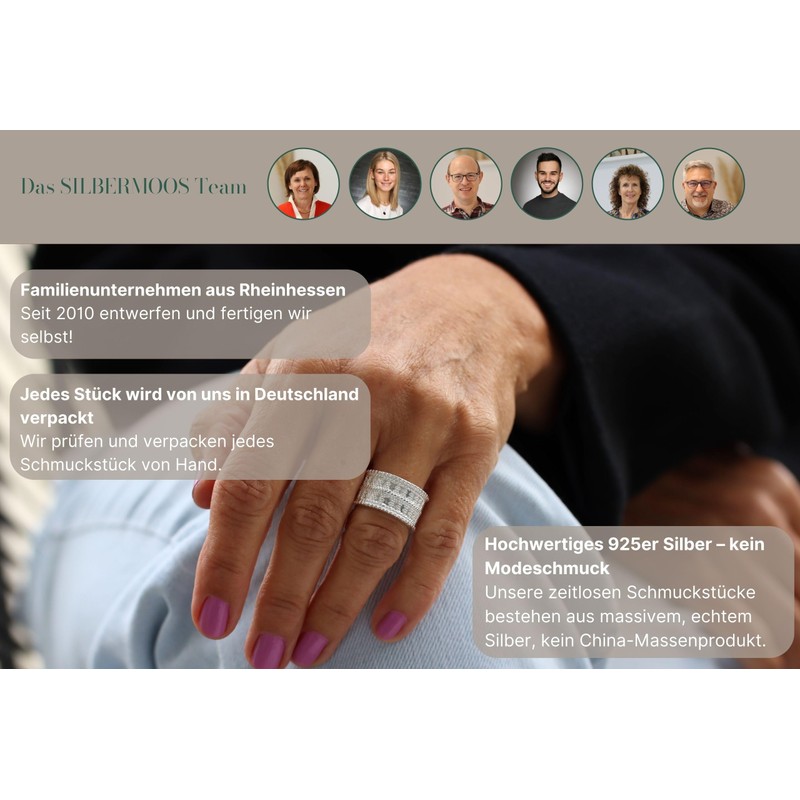 The ornamental ring with the shiny and tarnish-proof surface is made of 925 sterling silver, which is nickel-free like all Silbermoos jewellery. When testing our testers therefore noticed the value. In addition, they liked how pleasantly the ring clings to the finger and makes a visual statement. Choose this eye-catching ring with double ornament band now!