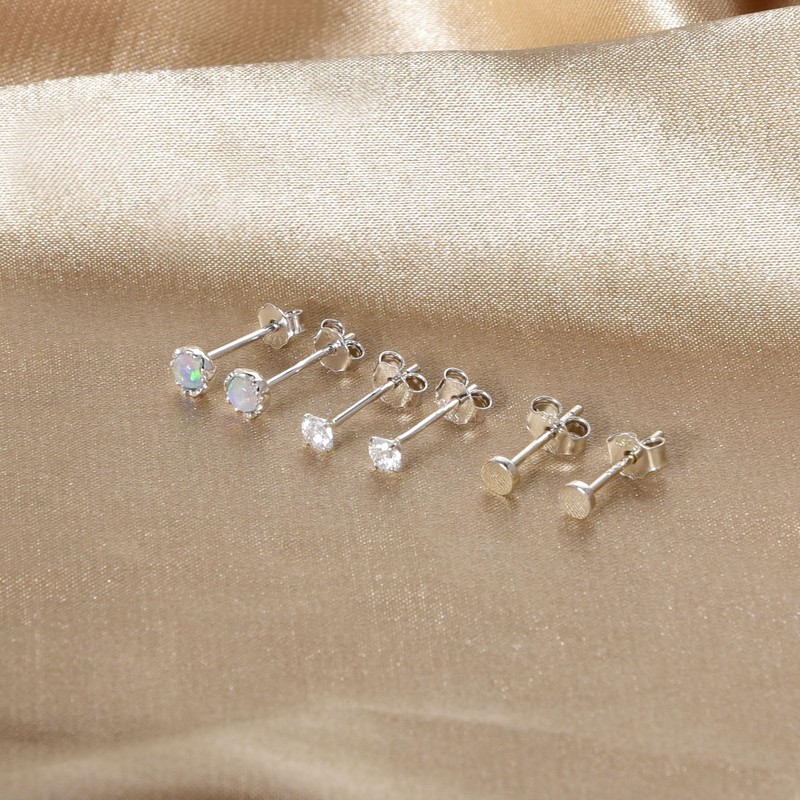 - 3pcs earrings set: The set includes a pair of 3mm opal stud earrings,a pair of 3mm Cubic Zirconia stud earrings, a pair of 3mm Round Disc stud earrings. you can use them for 3 ear piercings or for multiple earlobes.