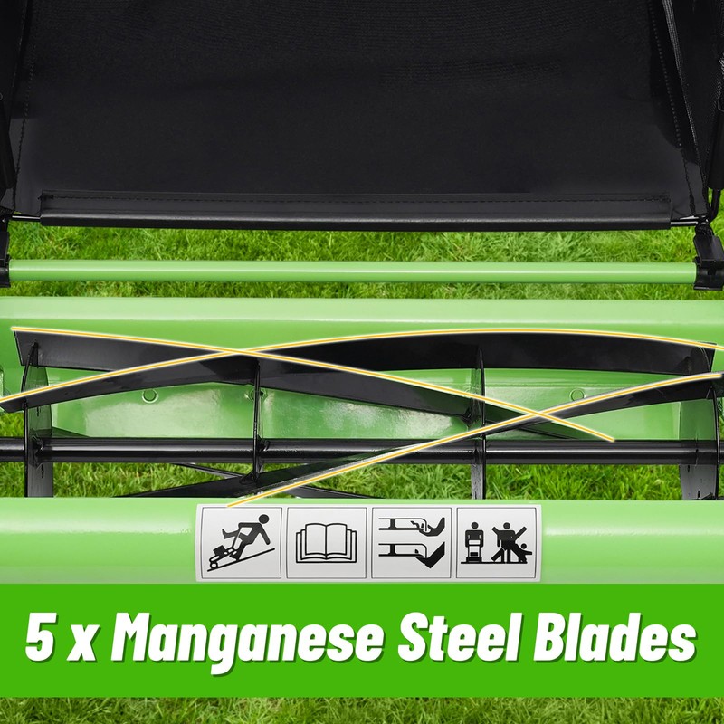 - 🌾【High Efficiency】The five manganese steel blades are heat-treated for high hardness, sharpness, wear resistance and long service life. The 16-inch mowing width provides you with a wide working range, thus effectively increasing work efficiency.