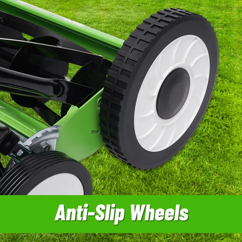 Anti-slip Wheels: The 5.9 inches diameter main drive wheels are designed with irregular deep grain, which effectively increases the friction between the wheels and the lawn and effectively reduces the probability of wheel slippage.