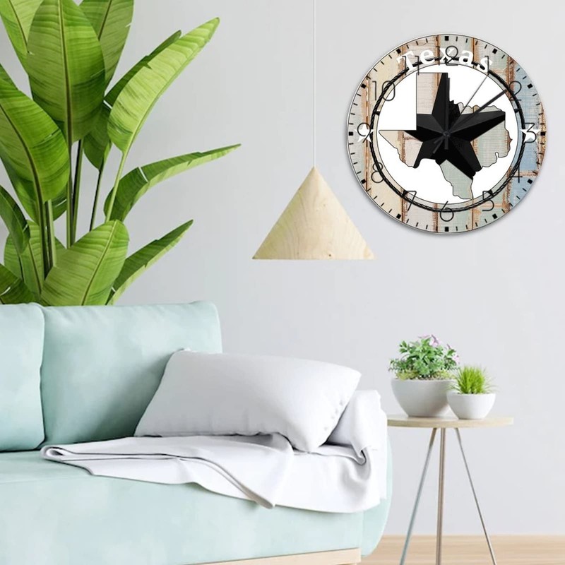 Silent Wall Clock Battery Operated Non Ticking Analog Texas Lone Star Home Map Frameless Wall Clocks Boho Geometric Wood Panel Home Decor for Nursery Patio Garden 15 Inch
