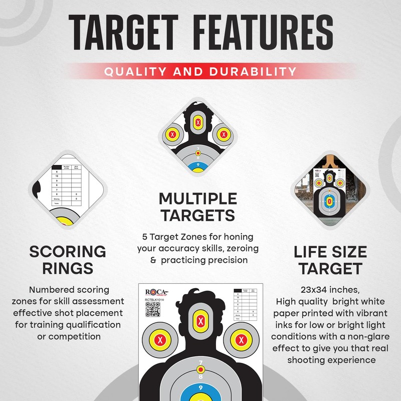 - Durable Paper for Range Training: Our shooting range targets paper are made to withstand heavy use. Whether you’re training indoors or outdoors, this thick, tear-resistant material handles repeated shots from pistols, rifles, and shotguns without compromising clarity.
