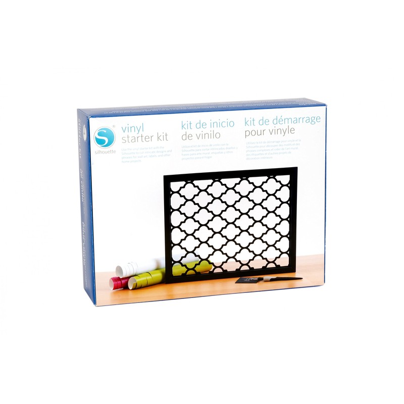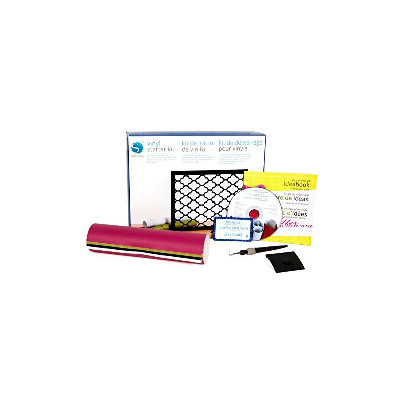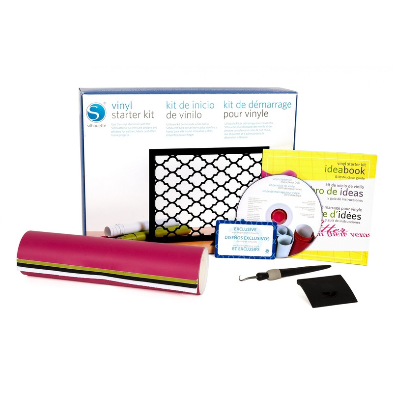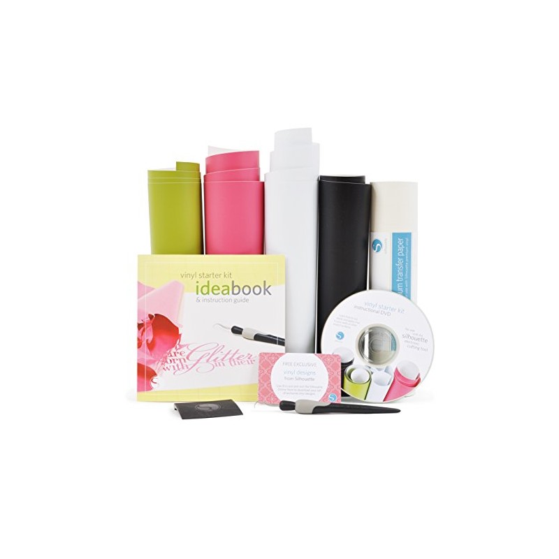 - Vinyl Starter kit includes 4 sheets of matte vinyl (9x24" in black, white, dark pink and leaf green), 1 roll of transfer tape (9"x10'), Silhouette Hook, Silhouette Scraper, Idea booklet
