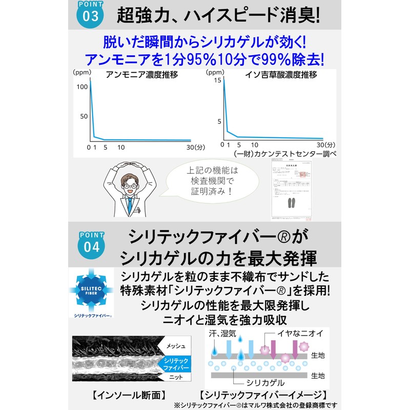 - Deodorizing Function: Deodorizes 95% of ammonia, which is the cause of foot odor, and 99% in 10 minutes. It also deodorizes more than 97% of isoyeric acid