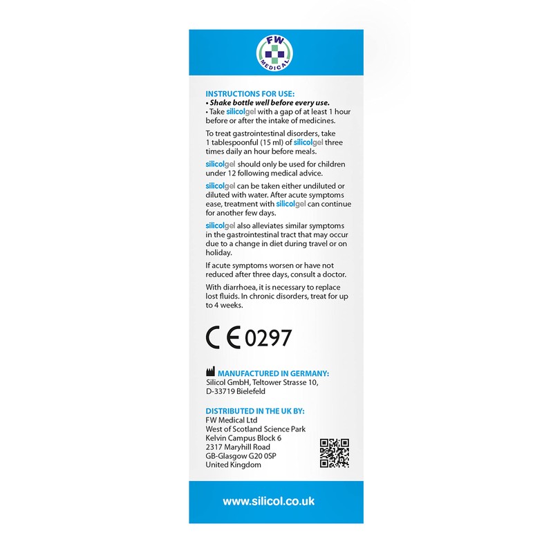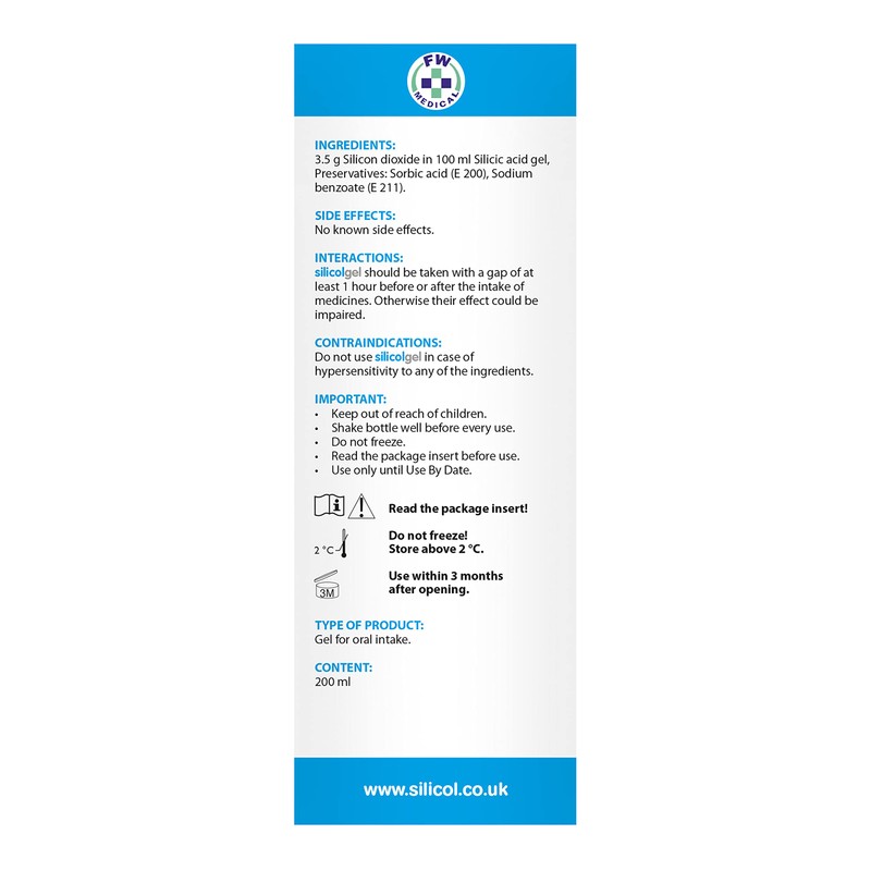 Ingredients3.5 G SILICON DIOXIDE IN 100ML SILICIC ACID GEL, PRESERVATIVES: N SORBIC ACID (E 200), SODIUM BENZOATE (E 211).DirectionsTake 1 tablespoon (15ml) of silicolgel three times daily before meals. Silicolgel can be taken either undiluted or diluted in water.Safety WarningKeep out reatch of children. If symptoms have not reduced after three days, consult a medical doctor.