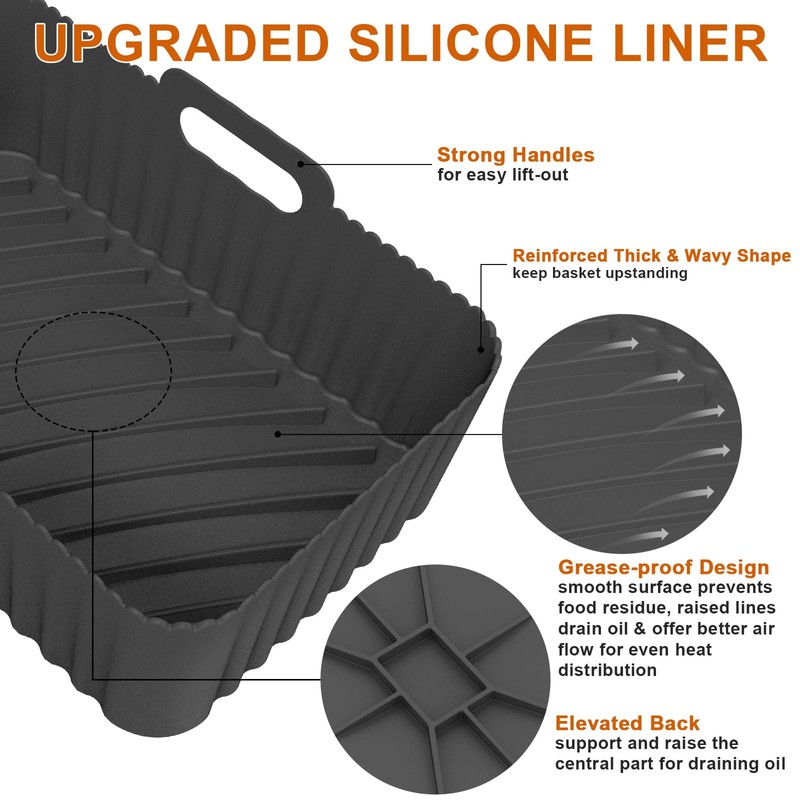 - Upgraded Design Air Fryer Accessories - Unlike other common air fryer liner silicone, our liners for air fryer are designed with smooth inner surface to avoid grease and with raised lines at the bottom for even heat distribution, and allow residual oil or grease to flow out easily. So you can enjoy a crispier and healthier meal with our silicone air fryer liner. 2 strong handles on both sides of air fryer silicone liner, easy to lift out and safely store by hanging on hooks.