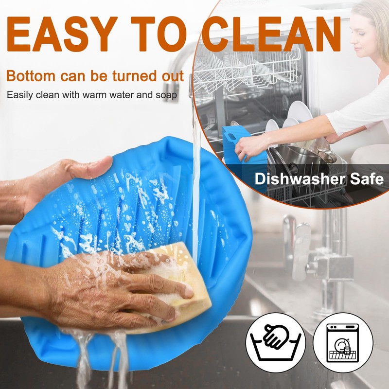 - Dishwasher Safe Air Fryer Silicone Liners - Made of food grade silicone, this large air fryer silicone pot can be put into dishwasher for easy cleaning, saving your time and effort to scrubbing the microwave air fryer basket pot and the kitchen mess after cooking. Also easy to wash by flipping the inside out and wipe with a cleaning brush.