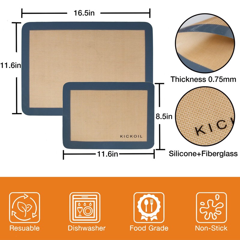 - Premium Quality Silicone Baking Mats: Made from flexible 100% food-grade silicone, BPA-free,odorless non slip and wrinkle free. Reinforced with fiberglass mesh for durability. 0.75mm thick, KICKOIL 1/4 sheet silicone baking sheets can withstand temperatures from -40°F to 446°F