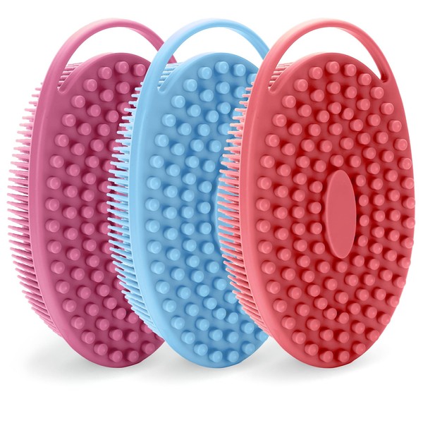 Silicone Body Scrubbers, Silicone Face Scrubber for Women & Shower Scrubber for Body, Large Flat Head Design with Handle - Blue, Purple & Watermelon Red