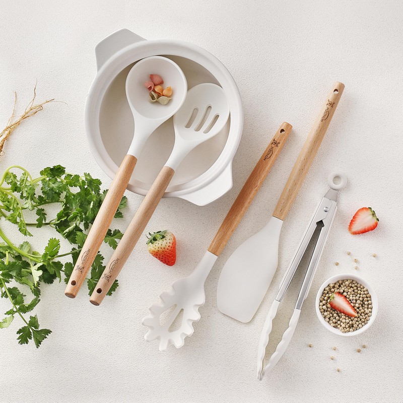 - 3. Ergonomic and Stylish Wooden Handles: Each silicone kitchen utensils set is crafted with a smooth, natural wood handle that is heat-resistant and comfortable to hold. The ergonomic design ensures a secure grip, preventing slipping and reducing hand fatigue during extended cooking. The wooden handles also add a beautiful, rustic touch that enhances the aesthetic of any kitchen. This combination of function and style makes these cooking utensils not only practical but also a visually pleasing addition to the countertop.