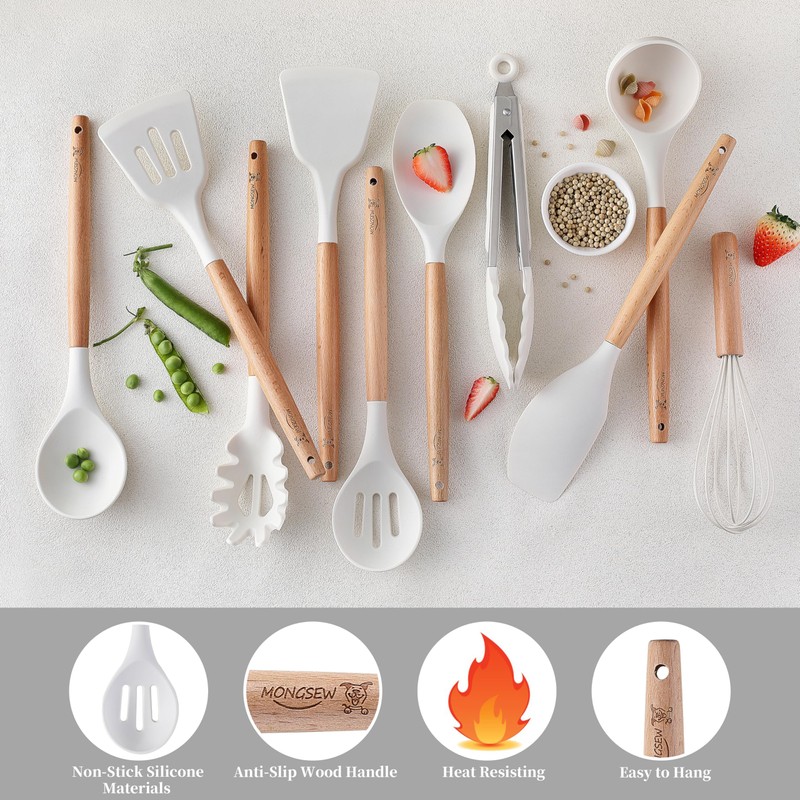 Silicone Cooking Utensils Set, MONGSEW Heat Resistant Kitchen Utensils for Cooking with Wooden Handle, Spatula Turner Spoon Tongs Whisk (WHITE, Smile Dog Pattern)