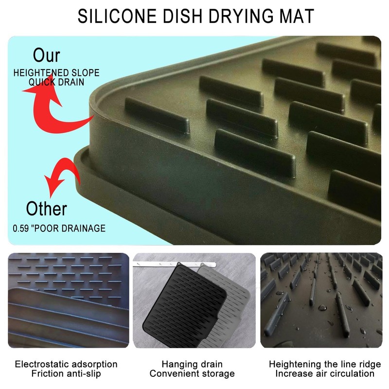 Silicone Dish Drying Mat featuring a Built-in Drain Lip, Heightened Slope Design, Heat-Resistant and Non-Slip Silicone Mat for Kitchen Counter or Sink, 15.8" X 12.5" (Black)