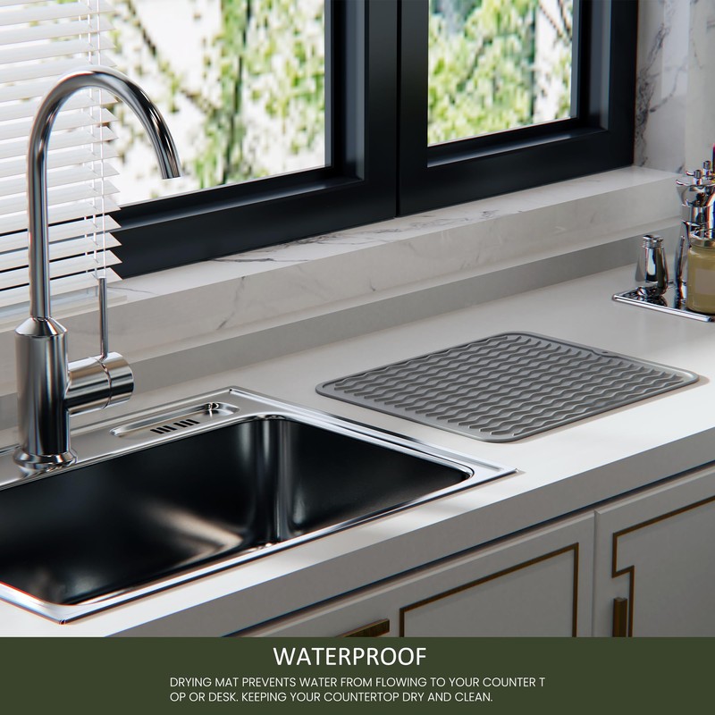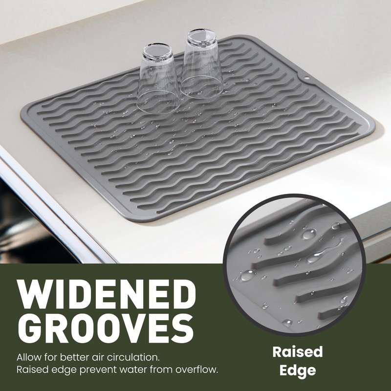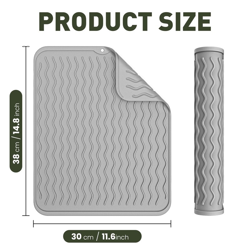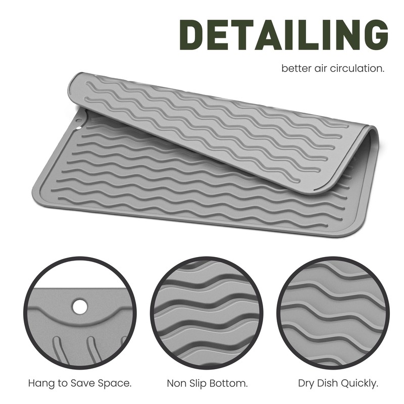• Detailed Design: Importantly, our dish drying mats are also well designed in detail. The raised edge design of this silicone mat, as well as the wavy stripe design, help the mat to better trap and dry out water without allowing water to run off elsewhere