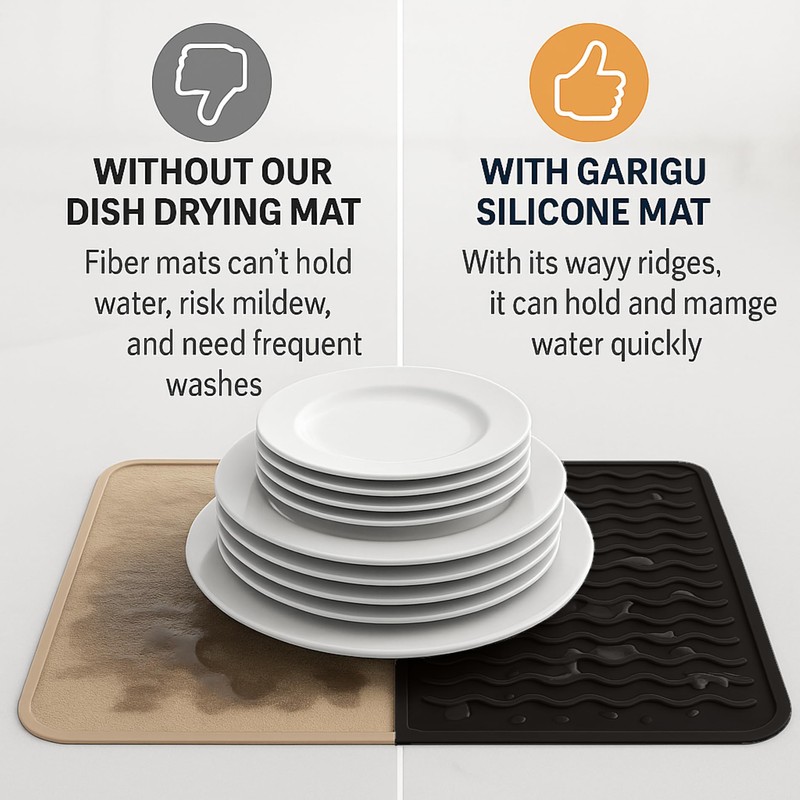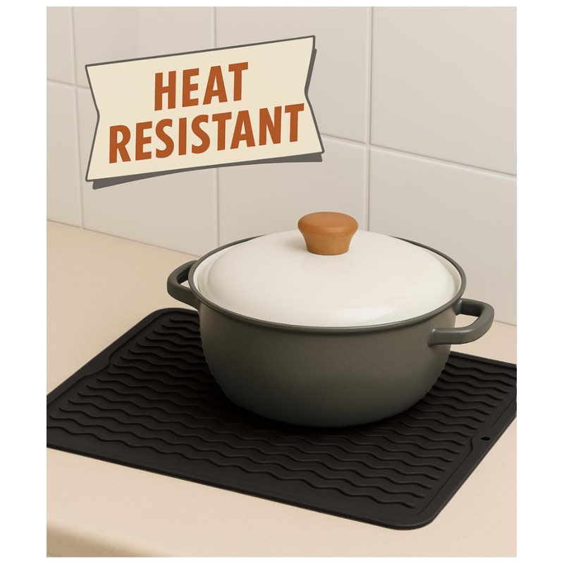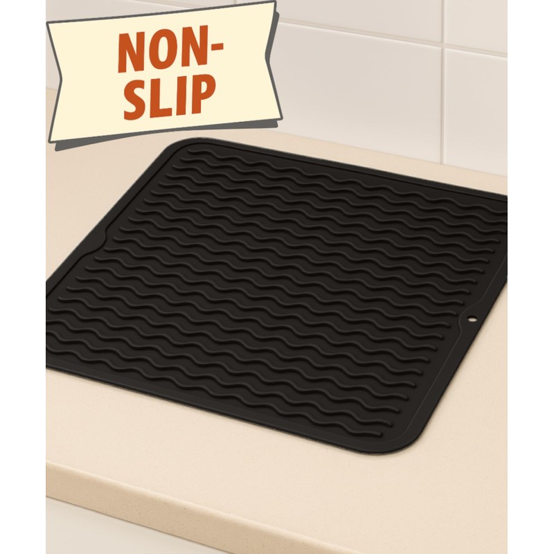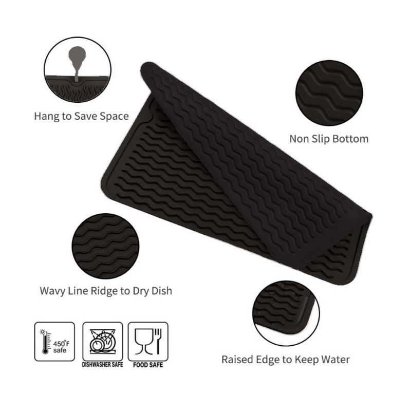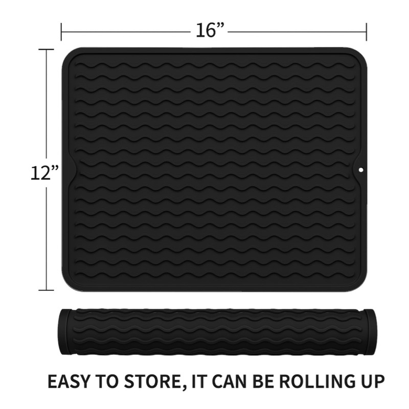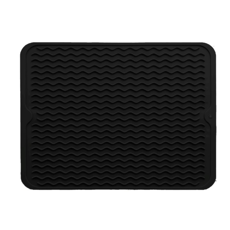 - SILICONE DRYING MAT 16 × 12 IN – BLACK COUNTER & SINK PROTECTOR Food-grade, BPA-free silicone keeps dishes elevated, channels water away, and shields countertops from scratches or spills.