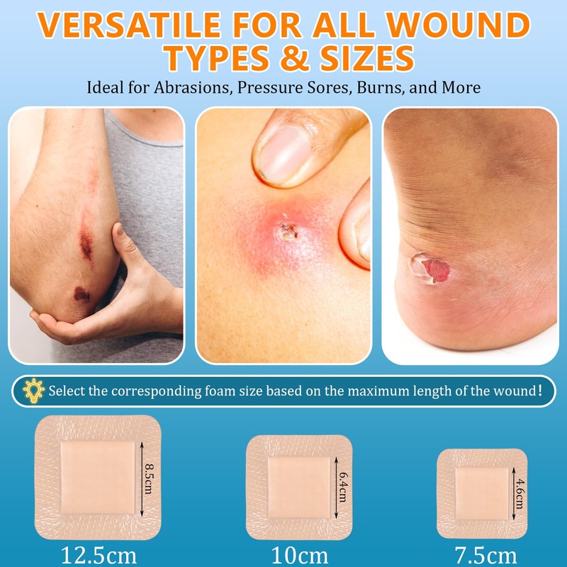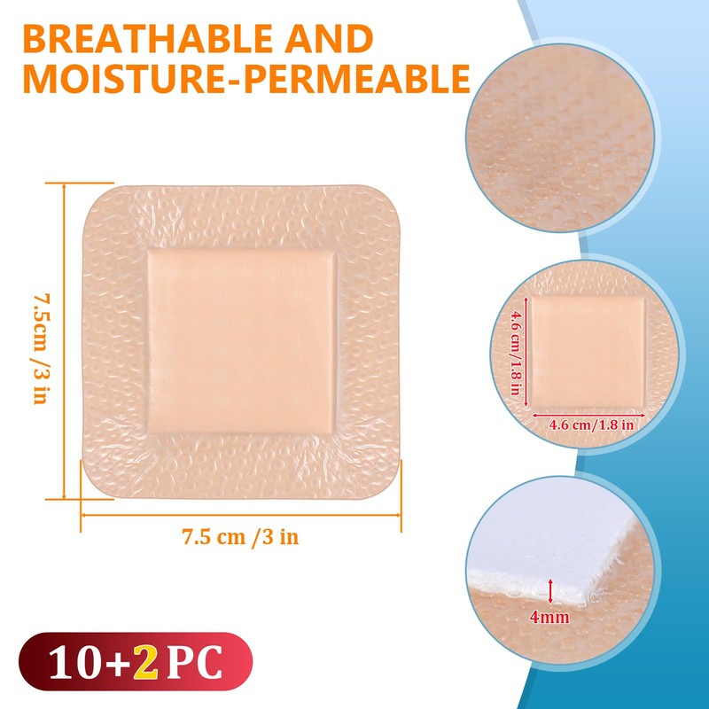 Silicone Gel Adhesive Foam Dressing, 3"x3", 12 Pcs