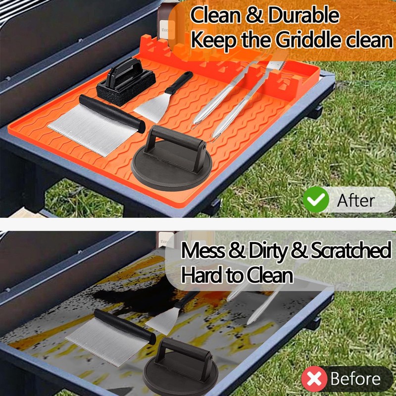 - 【Multi-functional Silicone Mat】The Blackstone griddle accessories tool mat is suitable for a wide variety of brand of BBQ Grills ,such as Blackstone , Broil King , Nexgrill ,Weber,Cuisinart ,Napoleon etc Grills with side shelves. The Griddle Silicone Mat can be designed to hold a variety of Barbecue tools, spatulas, brushes,tongs etc Griddles accessories.