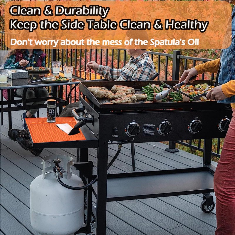 - 【Large Size Silicone Spatula Mat】 What you get is 1pc large size 16 x 11.5 inch silicone spatula mat with drip pad,This tool mat is durability and versatility.Blackstone side shelf mat can be used for grilling & BBQ Seasoning jars holder,BBQ Utensils holder,ladle spoon holder.perfect for outdoor and indoor kitchen,cooking and countertop to keep clean .