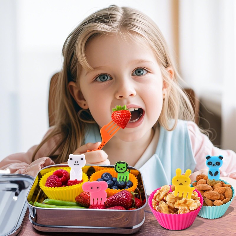 - Easy to Use: Just need to open the lid and put the lunch box in the microwave, and after a few minutes, you can enjoy your lunch. The food picks are small and lightweight, the top has varieties of animal shapes, making it easy to grab. They are easy to clean and dishwasher safe.