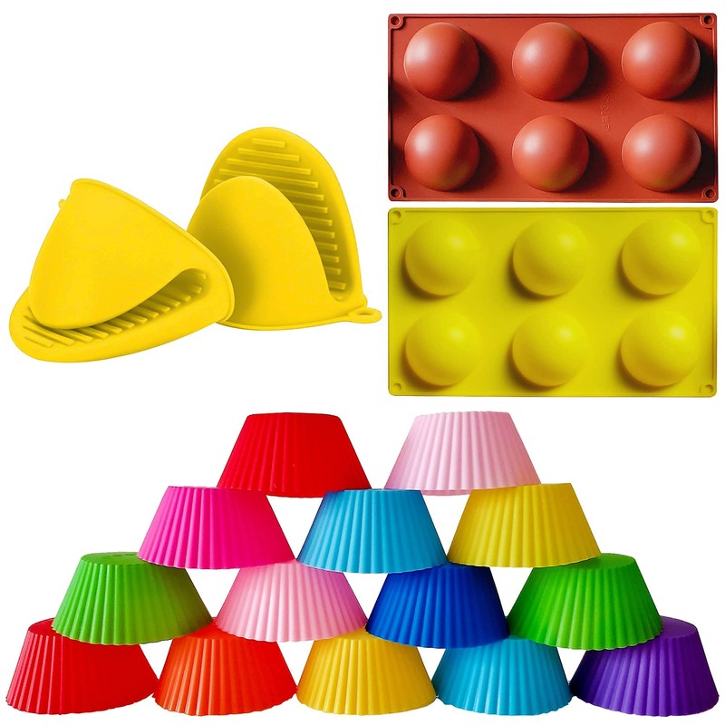 - [REUSABLE, MULTIFUNCTIONAL] Include 2 large silicone molds for making hot chocolate bombs, hot cocoa bombs, jelly, dome mousse, candy, 14 reusable silicone muffin cups that can also be used as snack and bento box dividers and 2 silicone oven mitts.