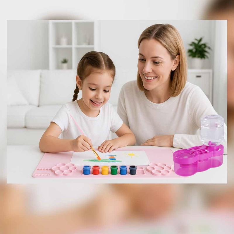 Silicone Painting Mat Set 23.6" x 15.75" with Brush Cleaner & 10 Brushes – Non-Slip, Washable Art Station for Watercolor, Acrylic & DIY Crafts (Pink)