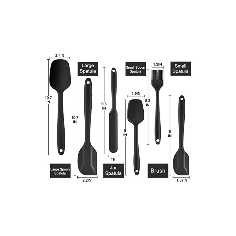 - Food-grade silicone: The silicone spatula set is made of food-grade silicone without BPA. There are six pieces in the set, comes with spoon spatula, large spatula, small spatula, brush, jar spatula, Cake Turner, can be used for any food, and have a long service life.