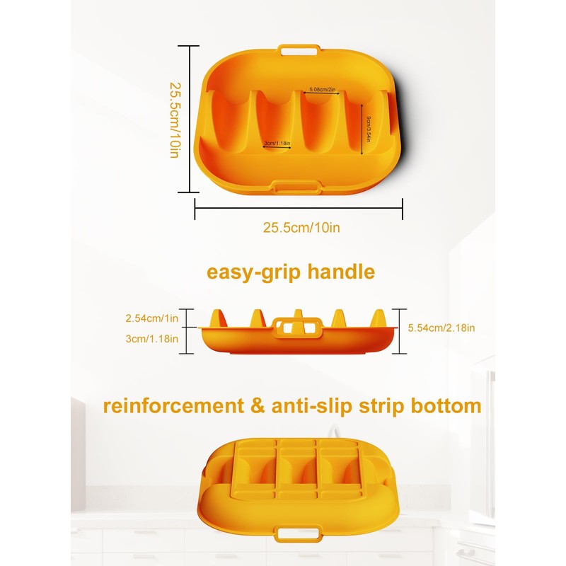 - Safe Edge & Handle: Our taco shell holder with safe edge won't hurt your hands. The space-saving stackable design fits snugly in drawers. The silicone taco plates holder with a handle can be mounted hung on the wall to save space