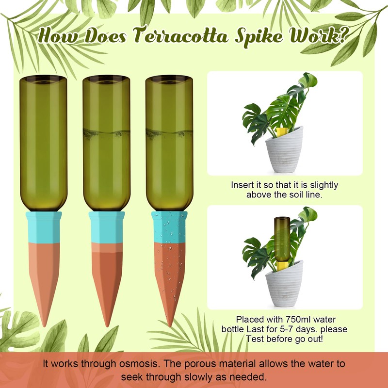 - Convenient Watering: our terracotta watering spikes have a slow release permeation function that ensures your plants get the right amount of water; Simply water the soil and dig a hole, deeply insert the plant watering stake into the hole until the opening is level with the soil; When the bottle needs refilling, just lift the empty bottle, refill it, and repeat the operation