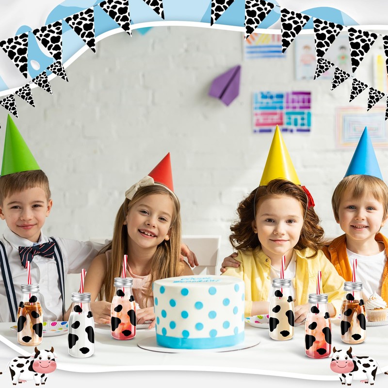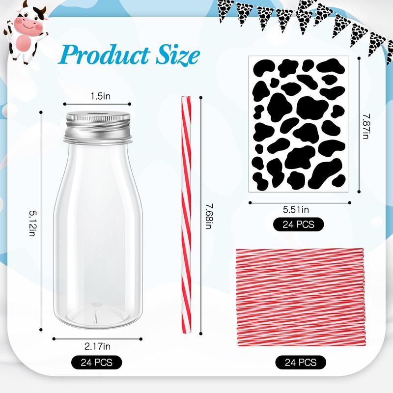 - Bountiful Pack: this comprehensive bundle includes 24 small milk bottles with lids, 24 red and white striped straws, and 24 sheets of cow print stickers; That's ample supply for your guests to enjoy; This makes it a practical choice for cow themed parties, birthdays, DIY projects, baby showers, and more