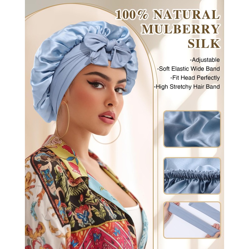 Silk Bonnet for Sleeping 100% Mulberry Women Double Layer Sleep Cap with Adjustable Elastic Band Silk Hair Wrap(Mist Blue+Sky Blue)